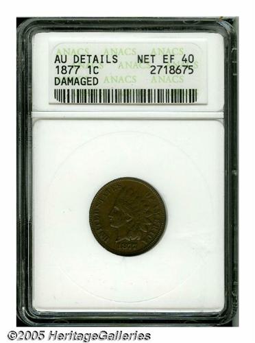 <B>1877<1C>--Damaged--ANACS. AU Details, Net XF40.</B></I> Numerous moderate marks are on the obverse, many among which are congregated on Liberty's cheek. A bold chocolate-brown example of this popular key date Cent.