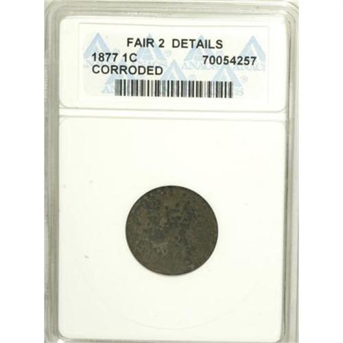 <B>1877 1C --Corroded--ANACS. Fair 2 Details.</B></I> NGC Census: (13/1180). PCGS Population (17/2033). Mintage: 852,500. (#2127)<BR><BR><B>Coin Engraver:</B> James B. Longacre<BR><BR><b>Shipping:</b> Coins & Currency (<a target="_blank" href="http://www.heritageauctions.com/common/shipping.php">view shipping information</a>)