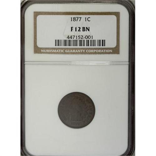<B>1877 1C Fine 12 NGC.</B></I> The letters of LIBERTY are weak but intact on this luminous mocha-hued cent. Minimally marked with impressive eye appeal for the grade assigned. A wonderful choice for a similarly graded date set.<BR><BR><B>Coin Engraver:</B> James B. Longacre<BR><BR><b>Shipping:</b> Coins & Currency (<a target="_blank" href="http://www.heritageauctions.com/common/shipping.php">view shipping information</a>)