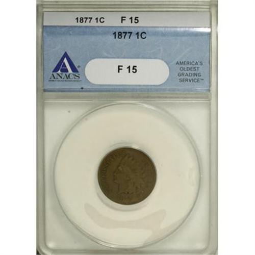 <B>1877 1C Fine 15 ANACS.</B></I> All seven letters of LIBERTY are discernible, though the B is a touch blurry. The walnut-brown surfaces show no overt distractions, and the overall eye appeal is impressive. An excellent choice for the series collector.<BR><BR><B>Coin Engraver:</B> James B. Longacre<BR><BR><b>Shipping:</b> Coins & Currency (<a target="_blank" href="http://www.heritageauctions.com/common/shipping.php">view shipping information</a>)