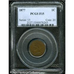 1877 1C Fine 15 PCGS. This key date has very pleas <B>1877 1C Fine 15 PCGS.</B></I> This key date has very pleasing light brown patina. The L,T, and Y of LIBERTY are clear, and the I and R partially show. The surfaces are relatively devoid of mentionable marks. <BR><BR><B>Important notice:</B> Heritage usually auctions material at the rate of 200-250 lots per hour. On some occasions eBay Live bid software or the Internet may not be able to keep up with the pace of the auction. We recommend placing a realistic absentee bid now as insurance to avoid disappointment. Occasionally the auctioneer may eliminate or reject an eBay Live bid, and the auctioneer may also reopen a lot after the close of the eBay live bidding (usually because we missed an audience bid), and may reject your bid even if it shows you as the winning bidder. By bidding via eBay Live, you agree that Heritage may award the lot to another bidder at its sole discretion under the circumstances described above or any other reasonable circumstances. Since eBay bids are not shown to us until we open the lot on the floor, we treat those bids just like floor bids. In most cases the floor responds before the eBay bid is presented to us, due to Internet lag time, so for consistency we have made it a policy that floor bids are always considered first over tie eBay live bids. Also please note that all Heritage lots purchased through eBay Live carry a 20% Buyer's Premium. Please make sure you read the Terms and Conditions before you bid. This lot is being auctioned in conjunction with a live floor auction by Heritage Galleries & Auctioneers. All final auction and invoice information will be supplied by Heritage Galleries & Auctioneers, and all other information should be considered preliminary. Lot:5090