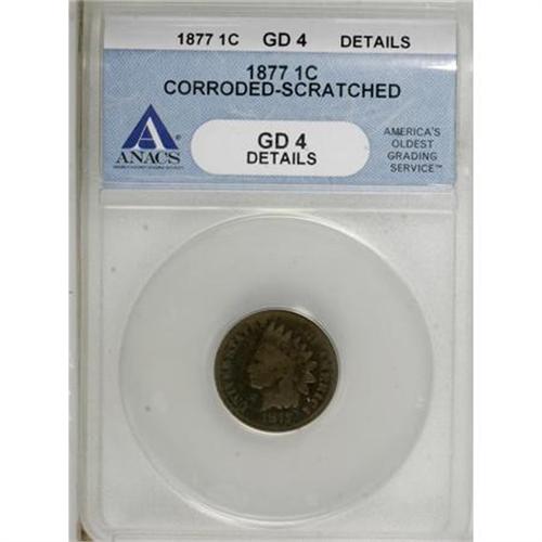 <B>1877 1C --Corroded, Scratched--ANACS. Good 4 Details.</B></I> NGC Census: (94/1001). PCGS Population (217/1735). Mintage: 852,500. Numismedia Wsl. Price for NGC/PCGS coin in G4 : $665. (#2127)<BR><BR><B>Coin Engraver:</B> James B. Longacre<BR><BR><b>Shipping:</b> Coins & Currency (<a target="_blank" href="http://www.heritageauctions.com/common/shipping.php">view shipping information</a>)