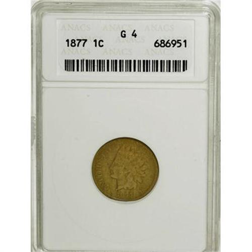 <B>1877 1C Good 4 ANACS.</B></I> The obverse shows slightly uneven wear which is a bit heavier on the upper right side. The reverse shows even wear. Chocolate-brown coloration is seen across both sides. Third-party authentication is always a good idea when purchasing an example of this rare key date. <BR><BR><B>Coin Engraver:</B> James B. Longacre<BR><BR><b>Shipping:</b> Coins & Currency (<a target="_blank" href="http://www.heritageauctions.com/common/shipping.php">view shipping information</a>)