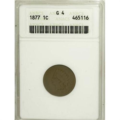 <B>1877 1C Good 4 ANACS.</B></I> A heavily circulated yet eminently desirable example of this Indian key, chocolate-brown overall with occasional orange and turquoise accents. While the L of LIBERTY shows modest definition on the headband, the central letters of CENT on the reverse are largely worn away.<BR><BR><B>Coin Engraver:</B> James B. Longacre<BR><BR><b>Shipping:</b> Coins & Currency (<a target="_blank" href="http://www.heritageauctions.com/common/shipping.php">view shipping information</a>)