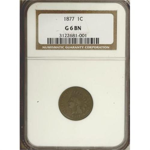 <B>1877 1C Good 6 NGC.</B></I> This chocolate-brown piece is an appealing, if heavily circulated, survivor from the immensely popular key Indian cent issue. On Liberty's headband, the L is weak but legible, as are the tops of the T and Y.<BR><BR><B>Coin Engraver:</B> James B. Longacre<BR><BR><b>Shipping:</b> Coins & Currency (<a target="_blank" href="http://www.heritageauctions.com/common/shipping.php">view shipping information</a>)