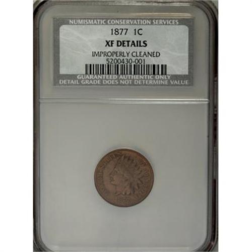 <B>1877 1C --Improperly Cleaned--NCS. XF Details.</B></I> This key-date coin is well-defined overall with only minor wear. Mahogany and pink-orange shadings converge on each side, with light hairlines and faint abrasions present in the fields and on the devices.<BR><BR><B>Coin Engraver:</B> James B. Longacre<BR><BR><b>Shipping:</b> Coins & Currency (<a target="_blank" href="http://www.heritageauctions.com/common/shipping.php">view shipping information</a>)