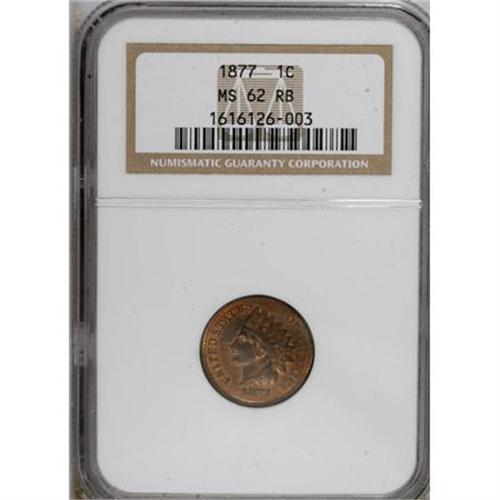 <B>1877 1C MS62 Red and Brown NGC.</B></I> Considerable bright orange-gold color resides in the recesses of this key-date representative, with tan-gold taking over in the open fields and higher areas of the design elements. Rather pronounced field-motif contrast is evident when the coin is tilted ever so slightly under a light source. The design elements display localized weakness, including the three lower diamonds. A few minute, inoffensive handling marks are seen on each side.<BR><BR><B>Coin Engraver:</B> James B. Longacre<BR><BR><b>Shipping:</b> Coins & Currency (<a target="_blank" href="http://www.heritageauctions.com/common/shipping.php">view shipping information</a>)