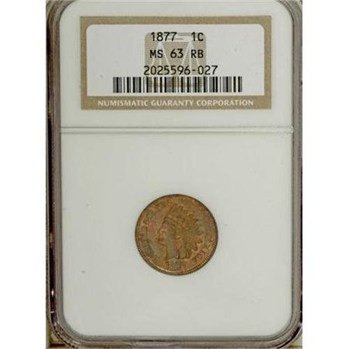 <B>1877 1C MS63 Red and Brown NGC.</B></I> An unworn and visually appealing example, pleasingly detailed with reddish-orange and walnut-brown surfaces. Shallow depressions on Liberty's neck and in the fields to the left are all that account for the grade. A noteworthy and highly desirable representative of this prominent Indian cent key, one far less available than its stated mintage of 852,500 pieces might suggest.<BR><BR><B>Coin Engraver:</B> James B. Longacre<BR><BR><b>Shipping:</b> Coins & Currency (<a target="_blank" href="http://www.heritageauctions.com/common/shipping.php">view shipping information</a>)