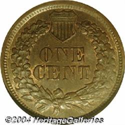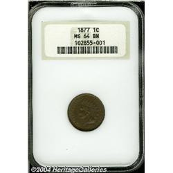 <B>1877<1C> MS64 Brown NGC.</B></I> Shallow N in ONE. Glimpses of gold color emerge from the legends and wreath, although deep chocolate-brown patina is dominant. Although the right borders are not fully struck, the design is generally sharp, and this impressive key date near-Gem is splendidly preserved. The 1877 has by far the lowest mintage of any Philadelphia Mint issue of the type. <BR><BR><B>Important notice:</B> Heritage usually auctions material at the rate of 200-250 lots per hour. On some occasions eBay Live bid software or the Internet may not be able to keep up with the pace of the auction. We recommend placing a realistic absentee bid now as insurance to avoid disappointment. Occasionally the auctioneer may eliminate or reject an eBay Live bid, and the auctioneer may also reopen a lot after the close of the eBay live bidding (usually because we missed an audience bid), and may reject your bid even if it shows you as the winning bidder. By bidding via eBay Live, you agree that Heritage may award the lot to another bidder at its sole discretion under the circumstances described above or any other reasonable circumstances. Since eBay bids are not shown to us until we open the lot on the floor, we treat those bids just like floor bids. In most cases the floor responds before the eBay bid is presented to us, due to Internet lag time, so for consistency we have made it a policy that floor bids are always considered first over tie eBay live bids. Also please note that all Heritage lots purchased through eBay Live carry a 20% Buyer's Premium. Please make sure you read the Terms and Conditions before you bid.