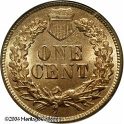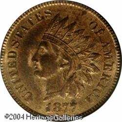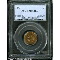 1877 1C MS64 Red PCGS. Only 852,500 pieces were st <B>1877 1C MS64 Red PCGS.</B></I> Only 852,500 pieces were struck of the 1877 Indian Cent--the second lowest mintage of the series and by far the most difficult date to locate in all grades. In Uncirculated grades, the 1877 is a very challenging coin as the date is needed by so many collectors of this popular 19th century series. This piece has original orange-red mint luster with the occasional deeper spot of color here and there. The striking details are soft and somewhat irregular as the coin appears to have been struck from misaligned dies with softer definition on the lower obverse and upper reverse while the upper obverse and lower reverse are quite strong. <BR><BR><B>Important notice:</B> Heritage usually auctions material at the rate of 200-250 lots per hour. On some occasions eBay Live bid software or the Internet may not be able to keep up with the pace of the auction. We recommend placing a realistic absentee bid now as insurance to avoid disappointment. Occasionally the auctioneer may eliminate or reject an eBay Live bid, and the auctioneer may also reopen a lot after the close of the eBay live bidding (usually because we missed an audience bid), and may reject your bid even if it shows you as the winning bidder. By bidding via eBay Live, you agree that Heritage may award the lot to another bidder at its sole discretion under the circumstances described above or any other reasonable circumstances. Since eBay bids are not shown to us until we open the lot on the floor, we treat those bids just like floor bids. In most cases the floor responds before the eBay bid is presented to us, due to Internet lag time, so for consistency we have made it a policy that floor bids are always considered first over tie eBay live bids. Also please note that all Heritage lots purchased through eBay Live carry a 20% Buyer's Premium. Please make sure you read the Terms and Conditions before you bid. This lot is being auctioned in conjunction with a live floor auction by Heritage Galleries & Auctioneers. All final auction and invoice information will be supplied by Heritage Galleries & Auctioneers, and all other information should be considered preliminary. Lot:5094