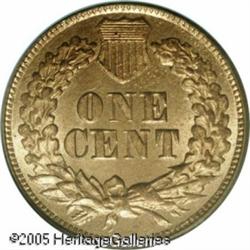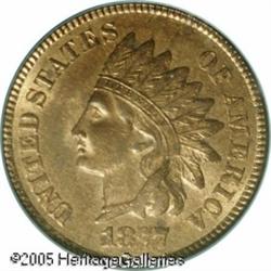 <B>1877 1C MS64 Red PCGS.</B></I> Only 852,500 pieces were struck of the 1877 Indian Cent--the second lowest mintage of the series and by far the most difficult date to locate in all grades. In Uncirculated grades, the 1877 is a very challenging coin as the date is needed by so many collectors of this popular 19th century series. This piece has original orange-red mint luster with the occasional deeper spot of color here and there. The striking details are soft and somewhat irregular as the coin appears to have been struck from misaligned dies with softer definition on the lower obverse and upper reverse while the upper obverse and lower reverse are quite strong. Lot:5230