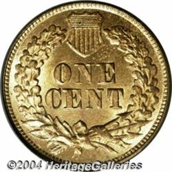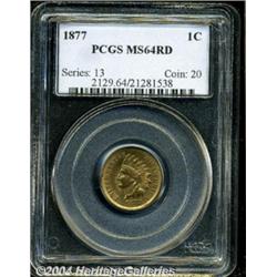 <B>1877<1C> MS64 Red PCGS.</B></I> Only 852,500 pieces were struck of the 1877 Indian cent--the second lowest mintage of the series and by far the most difficult date to locate in all grades. In Uncirculated grades, the 1877 is a very challenging coin as the date is needed by so many collectors of this popular 19th century series. This piece has original orange-red mint luster with the occasional deeper spot of color here and there. The striking details are soft and somewhat irregular as the coin appears to have been struck from misaligned dies with softer definition on the lower obverse and upper reverse while the upper obverse and lower reverse are quite strong. <BR><BR><B>Important notice:</B> Heritage usually auctions material at the rate of 200-250 lots per hour. On some occasions eBay Live bid software or the Internet may not be able to keep up with the pace of the auction. We recommend placing a realistic absentee bid now as insurance to avoid disappointment. Occasionally the auctioneer may eliminate or reject an eBay Live bid, and the auctioneer may also reopen a lot after the close of the eBay live bidding (usually because we missed an audience bid), and may reject your bid even if it shows you as the winning bidder. By bidding via eBay Live, you agree that Heritage may award the lot to another bidder at its sole discretion under the circumstances described above or any other reasonable circumstances. Since eBay bids are not shown to us until we open the lot on the floor, we treat those bids just like floor bids. In most cases the floor responds before the eBay bid is presented to us, due to Internet lag time, so for consistency we have made it a policy that floor bids are always considered first over tie eBay live bids. Also please note that all Heritage lots purchased through eBay Live carry a 20% Buyer's Premium. Please make sure you read the Terms and Conditions before you bid. </span></font></tr></table></td></tr></table>
