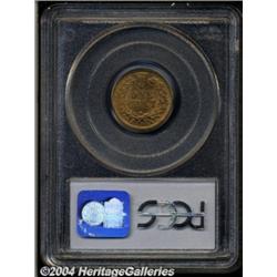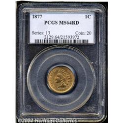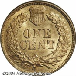 <B>1877<1C> MS64 Red PCGS.</B></I> The key date of the Indian Cent series, and one that has always been considered scarce and desirable. This specimen is slightly muted and exhibits an untoned, coppery-gold appearance. There are a few minor carbon flecks on the reverse, and the strike is a bit soft on the right obverse, and the shield on the reverse. Surely, if it weren't for the slight deficiency of detail, this coin would be a higher grade. <BR><BR><B>Important notice:</B> Heritage usually auctions material at the rate of 200-250 lots per hour. On some occasions eBay Live bid software or the Internet may not be able to keep up with the pace of the auction. We recommend placing a realistic absentee bid now as insurance to avoid disappointment. Occasionally the auctioneer may eliminate or reject an eBay Live bid, and the auctioneer may also reopen a lot after the close of the eBay live bidding (usually because we missed an audience bid), and may reject your bid even if it shows you as the winning bidder. By bidding via eBay Live, you agree that Heritage may award the lot to another bidder at its sole discretion under the circumstances described above or any other reasonable circumstances. Since eBay bids are not shown to us until we open the lot on the floor, we treat those bids just like floor bids. In most cases the floor responds before the eBay bid is presented to us, due to Internet lag time, so for consistency we have made it a policy that floor bids are always considered first over tie eBay live bids. Also please note that all Heritage lots purchased through eBay Live carry a 20% Buyer's Premium. Please make sure you read the Terms and Conditions before you bid. </span></font></tr></table></td></tr></table>