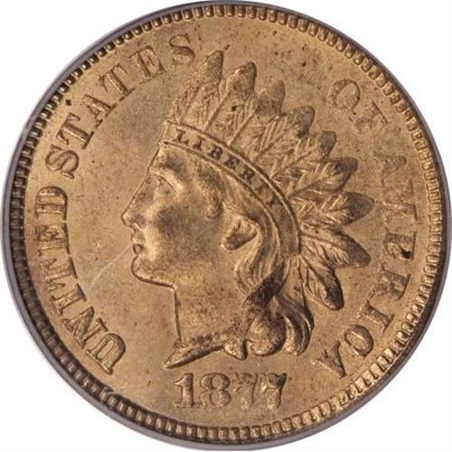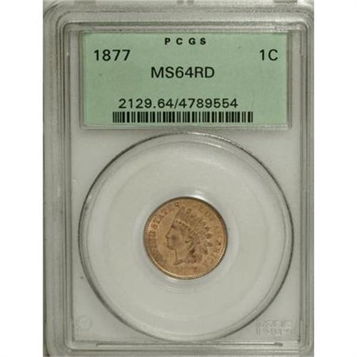 <B>1877 1C MS64 Red PCGS.</B></I> Richard Snow (2006) writes: " ... the purported original mintage of this date (852,500 business strikes) appears to be way too high compared to the number of observed surviving examples. An upper estimate of 200,000 coins struck seems more accurate." The near-Gem example in this lot displays lustrous copper-gold surfaces devoid of any abrasions or unsightly spots, though for complete accuracy we mention some scattered light flecks on the reverse. Occasional minor strike softness is noted, including incomplete definition on the diamonds. This is not unusual, as Snow indicates: " ... the diamond detail for this issue is typically shallow." Housed in a green-label holder. Population: 40 in 64 Red, 27 finer (6/07).<BR><BR><b>Shipping:</b> Coins & Currency (<a target="_blank" href="http://www.heritageauctions.com/common/shipping.php">view shipping information</a>)