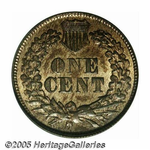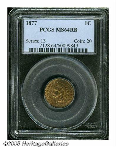 <B>1877<1C> MS64 Red and Brown PCGS.</B></I> The 1877 has always held a favored position as the key issue in the Indian cent series. Its low mintage of only 852,500 pieces explains its scarcity in all grades. It is especially difficult to locate in mint condition and with remnants of original mint color. This is an attractive coin that is well defined. Most of the original mint red is still evident beneath the woodgrain pattern of brown that overlies each side. The only trace of carbon we see is a small spot beneath the ribbon end on the lower reverse. An exceptionally good value and sure to be of interest to a wide range of collectors. Population: 118 in 64, 41 finer (3/05).