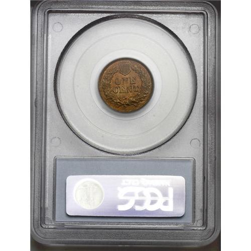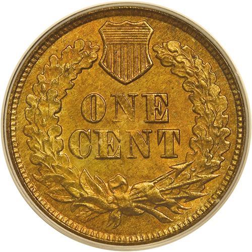<B>1877<1C> MS64 Red and Brown PCGS.</B></I> The bright, shimmering surfaces of this key date near-Gem are truly a delight to behold. The pleasing lime-green and red-orange toning occurs in a variegated fashion on both sides, with lime-green dominating on the obverse and red-orange on the reverse. The generally crisp striking details are only partially incomplete on a couple of the upper headdress feather tips, and diagnostically so on the N in ONE. Wispy contact marks are noted on Liberty's cheekbone and in the lower left obverse field. A lovely high-end example that should please even the most demanding Indian cent specialist.<BR><I>From The New York Eye Appeal Collection.</B></I>