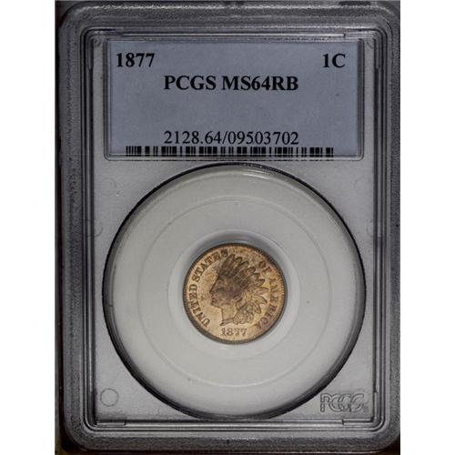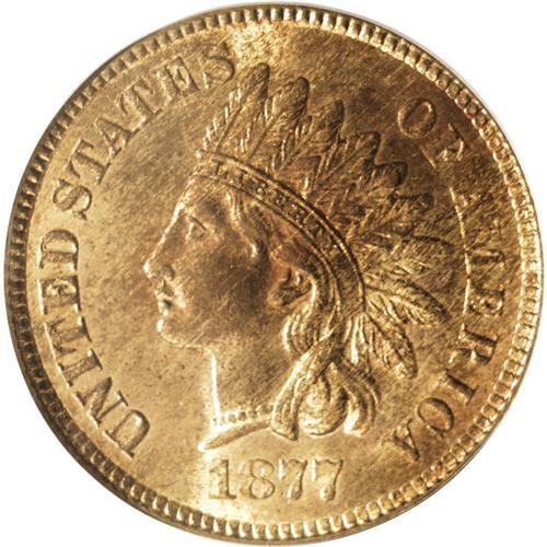 <B>1877<1C> MS64 Red and Brown PCGS.</B></I> The pale orange and gold surfaces are predominantly red, but the upper headdress and the cheek exhibit blushes of ruby toning. A lustrous and beautifully preserved example of this famous, low mintage series key. The shallow N in ONE helps identify the piece as a business strike rather than a proof, which were produced from the bold N reverse hub. A double set of clash marks is found above the O in ONE.