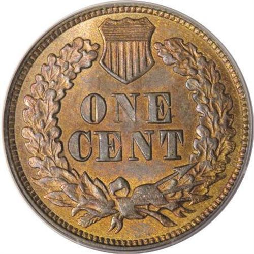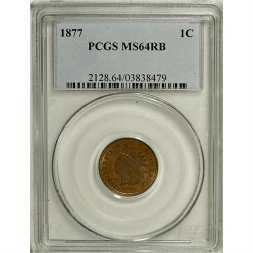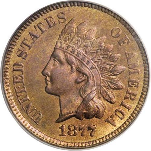 <B>1877 1C MS64 Red and Brown PCGS.</B></I> Orange-red occupies the obverse field, while the portrait is ruby-red. The reverse is about equally divided into areas of gold, fire-red, lilac, and steel-blue. This key date cent has pleasing luster and lacks remotely relevant contact. A good strike, although the right border and a few feathertips are incompletely brought up.<BR><BR><b>Shipping:</b> Coins & Currency (<a target="_blank" href="http://www.heritageauctions.com/common/shipping.php">view shipping information</a>)