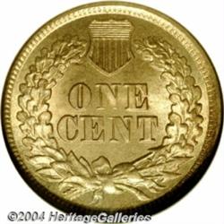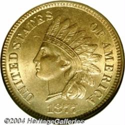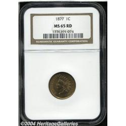 <B>1877<1C> MS65 Red NGC.</B></I> A shortage of copper resulted in the mint's limited production of Indian Cents in 1877. A paltry total of 852,500 pieces were struck, and, while the final-year 1909-S has a lower mintage (309,000 pieces), the '77 is the undisputed key to this widely collected series. It seems likely that while the 1909-S survived in sufficient numbers (thanks to heightened public awareness of numismatics in the early 20th century), most examples of the 1877 production entered economic channels. Not so with the present Gem, whose surfaces are smooth with virtually no blemishes to report. Both sides are aglow with rich orange-red luster, and the strike is bold in most areas. A little softness of detail is noted on the obverse at the tips of the feathers in Liberty's headdress. For future identification, a small mark resembling a lintmark is visible in the left obverse field under the A of STATES. <BR><I>From The Sarasota Collection.</B></I> <BR><BR><B>Important notice:</B> Heritage usually auctions material at the rate of 200-250 lots per hour. On some occasions eBay Live bid software or the Internet may not be able to keep up with the pace of the auction. We recommend placing a realistic absentee bid now as insurance to avoid disappointment. Occasionally the auctioneer may eliminate or reject an eBay Live bid, and the auctioneer may also reopen a lot after the close of the eBay live bidding (usually because we missed an audience bid), and may reject your bid even if it shows you as the winning bidder. By bidding via eBay Live, you agree that Heritage may award the lot to another bidder at its sole discretion under the circumstances described above or any other reasonable circumstances. Since eBay bids are not shown to us until we open the lot on the floor, we treat those bids just like floor bids. In most cases the floor responds before the eBay bid is presented to us, due to Internet lag time, so for consistency we have made it a policy that floor bids are always considered first over tie eBay live bids. Also please note that all Heritage lots purchased through eBay Live carry a 20% Buyer's Premium. Please make sure you read the Terms and Conditions before you bid. </span></font></tr></table></td></tr></table>