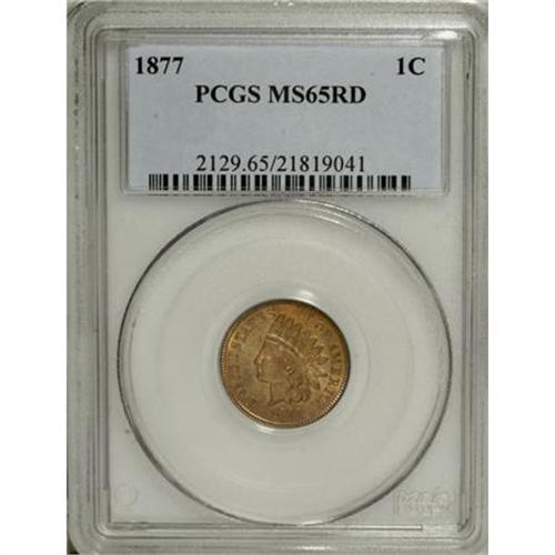 <B>1877 1C MS65 Red PCGS.</B></I> Although the 1909-S Indian cent has a lower mintage than the 1877, the latter is regarded as the key to the series, since few pieces were set aside, while the 1909-S was hoarded to some degree due to the change in designs that year. When encountered, 1877 cents are usually in well worn grades, and often corroded. High grade, full Red examples are under great demand from collectors of this popular series. This highly lustrous Gem features gold centers, bordered by reddish-orange color near the rims. The strike is decidedly above average, and surface imperfections, such as a tiny mint-made planchet flaw in the field near the chin, are unimportant. As usual for business strikes for this important issue, the N in ONE is shallow, unlike proof 1877 cents, which feature a bold N in ONE. In fact, the business strike 1877 marks the final appearance of the shallow N reverse subtype, which had begun to be phased out in 1870. Population: 21 in 65, 6 finer (3/07).<BR><BR><b>Shipping:</b> Coins & Currency (<a target="_blank" href="http://www.heritageauctions.com/common/shipping.php">view shipping information</a>)