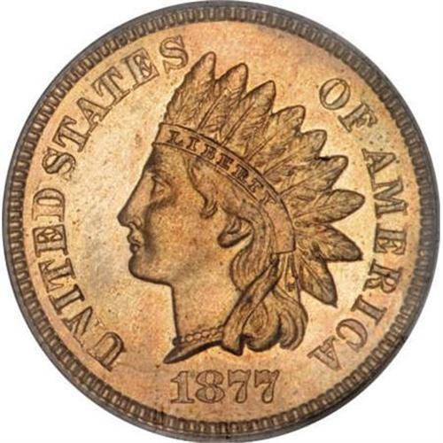 <B>1877 1C MS65 Red PCGS.</B></I> Although the 1909-S Indian cent has a lower mintage than the 1877, the latter is regarded as the key to the series, since few pieces were set aside, while the 1909-S was hoarded to some degree due to the change in designs that year. When encountered, 1877 cents are usually in well worn grades, and often corroded. High grade, full Red examples are under great demand from collectors of this popular series. This highly lustrous Gem features gold centers, bordered by reddish-orange color near the rims. The strike is decidedly above average, and surface imperfections, such as a tiny mint-made planchet flaw in the field near the chin, are unimportant. As usual for business strikes for this important issue, the N in ONE is shallow, unlike proof 1877 cents, which feature a bold N in ONE. In fact, the business strike 1877 marks the final appearance of the shallow N reverse subtype, which had begun to be phased out in 1870. Population: 22 in 65, 6 finer (3/08).<BR><BR><B>Coin Engraver:</B> James B. Longacre<BR><BR><b>Shipping:</b> Coins & Currency (<a target="_blank" href="http://www.heritageauctions.com/common/shipping.php">view shipping information</a>)