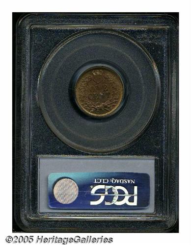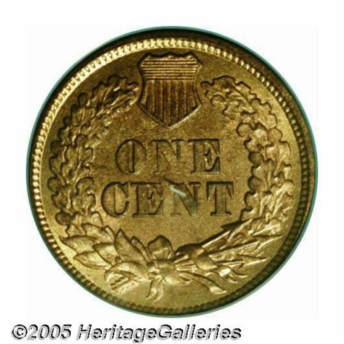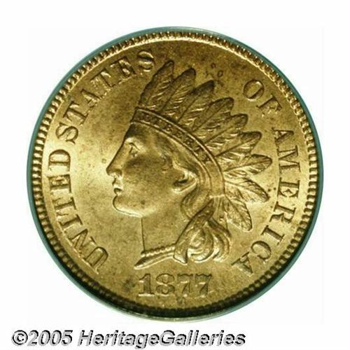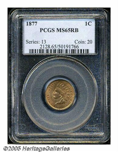 <B>1877<1C> MS65 Red and Brown PCGS.</B></I> Even though the 1877 has the second lowest mintage in the series, it is the undisputed key for any Indian cent collection. This is a remarkably well preserved coin that retains most of the mint red with just the slightest overlay of brown patina. The striking details are sharp also with nearly complete definition at the tips of the feathers in the headdress. A few small specks of carbon are present, but these blend in well with the brownish overlay of color and they present no difficulty with the technical grade of this important coin. Population: 36 in 65, 3 finer (3/05).