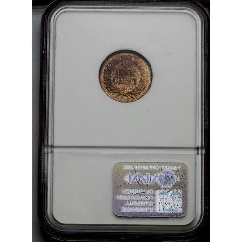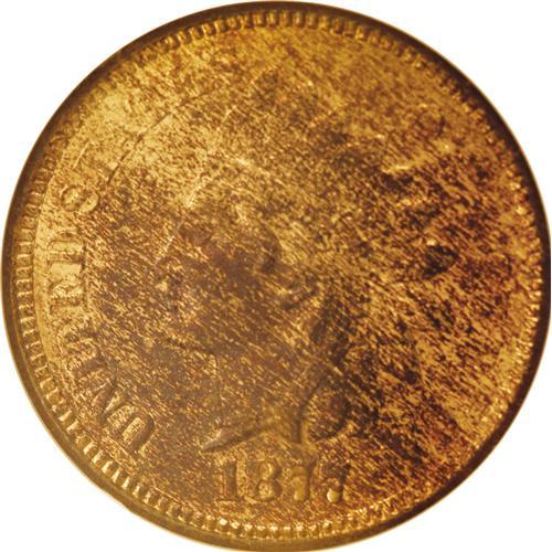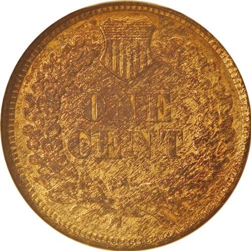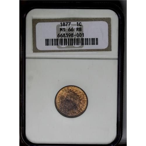 <B>1877<1C> MS66 Red and Brown NGC.</B></I> Both sides show pretty orange-gold surfaces with a smattering of deep purple-brown on the lower obverse and the upper reverse. The strike is well brought up, even to the tips of the foremost feathers in the headdress, which are often found weak. The date is bold, although OF AMERICA shows a bit of softness. The low mintages of copper Indian cents from 1871 to 1877 were accomplished by melting and recoinage of the old large cents, but by 1877 the supplies were exhausted. Census: 8 in 66 Red and Brown, 0 finer (7/06).