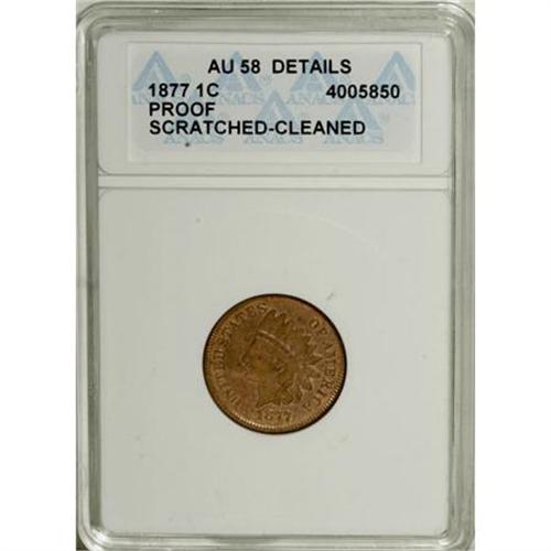 <B>1877 1C --Scratched, Cleaned--ANACS. AU58 Details.</B></I> Bold N in ONE. This key cent proof cent has a single pinscratch concealed within the headdress, and the left obverse field has a few faint hairlines. Nonetheless, this is an attractive example that provides excellent value relative to a well circulated 1877 business strike.<BR><BR><B>Coin Engraver:</B> James B. Longacre<BR><BR><b>Shipping:</b> Coins & Currency (<a target="_blank" href="http://www.heritageauctions.com/common/shipping.php">view shipping information</a>)