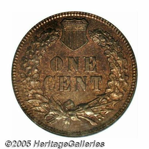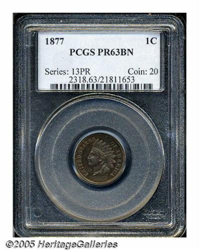 <B>1877<1C> PR63 Brown PCGS.</B></I> Soft brown color with reddish undertones occupies the devices, while the fields reveal a melange of sea-green and blue. Generally sharply struck, though a couple of the feather tips are soft. The surfaces are essentially free of contact marks, save for a single tiny one under the E of CENT. Proofs are in demand, as Uncirculated business strikes of this low mintage issue are difficult to obtain. Population: 11 in 63 Brown, 18 finer (3/05).