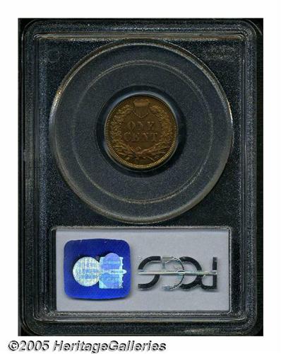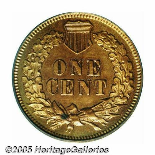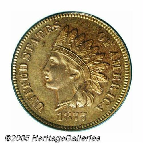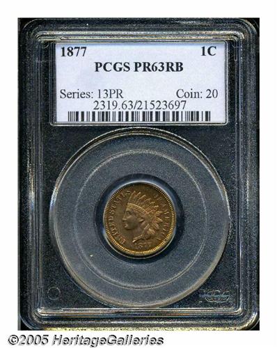 <B>1877<1C> PR63 Red and Brown PCGS.</B></I> Hints of modest reflectivity are seen in the fields of this sharply defined specimen. The surfaces are predominantly orange-brown in shade, some green-gold and crimson color is evident over the reverse. An affordable proof representative of this popular Indian cent.