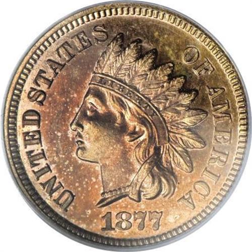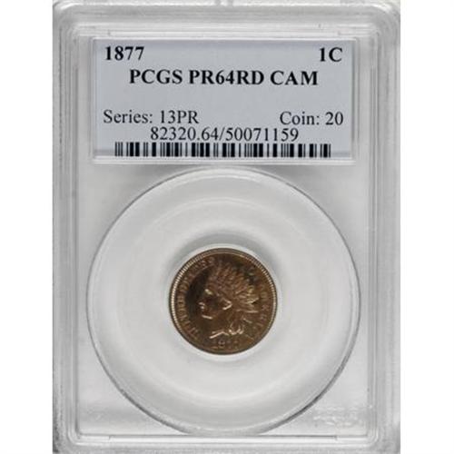<B>1877 1C PR64 Red Cameo PCGS.</B></I> Stunning field-motif contrast shows on both faces of this near-Gem, fully Red Cameo. Golden-orange color is interspersed on the reverse with wisps of crimson, and a well executed strike leaves no design element incomplete. There are no mentionable contact marks; a few tiny, inoffensive obverse flecks likely limit the grade. <BR> The actual 1877 proof mintage is unknown. Walter Breen in his <I>Proof Encyclopedia</B></I> suggested a mintage of 510+ coins, but research by Robert Julian revised the estimate to 900, the figure appearing in the 2008 <I>Guide Book</B></I>. Population: 4 in 64 Red Cameo, 4 finer (11/07).<BR><I>From The New York Eye Appeal Collection, Part Three.</B></I><BR><BR><b>Shipping:</b> Coins & Currency (<a target="_blank" href="http://www.heritageauctions.com/common/shipping.php">view shipping information</a>)