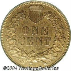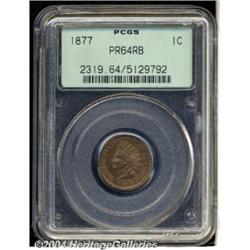 <B>1877<1C> PR64 Red and Brown PCGS.</B></I> Bold N in ONE. This sharply struck near-Gem has considerable glowing gold color throughout the fields, although it has partly blended with lilac hues. Tiny spots below the first T in STATES and above the E in LIBERTY are all that deny an even finer grade, since the surfaces are essentially unabraded. Certified in a green label holder. <BR><BR><B>Important notice:</B> Heritage usually auctions material at the rate of 200-250 lots per hour. On some occasions eBay Live bid software or the Internet may not be able to keep up with the pace of the auction. We recommend placing a realistic absentee bid now as insurance to avoid disappointment. Occasionally the auctioneer may eliminate or reject an eBay Live bid, and the auctioneer may also reopen a lot after the close of the eBay live bidding (usually because we missed an audience bid), and may reject your bid even if it shows you as the winning bidder. By bidding via eBay Live, you agree that Heritage may award the lot to another bidder at its sole discretion under the circumstances described above or any other reasonable circumstances. Since eBay bids are not shown to us until we open the lot on the floor, we treat those bids just like floor bids. In most cases the floor responds before the eBay bid is presented to us, due to Internet lag time, so for consistency we have made it a policy that floor bids are always considered first over tie eBay live bids. Also please note that all Heritage lots purchased through eBay Live carry a 20% Buyer's Premium. Please make sure you read the Terms and Conditions before you bid. </span></font></tr></table></td></tr></table>