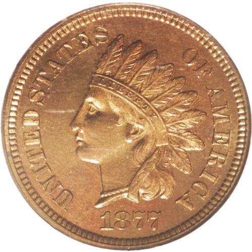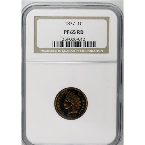 <B>1877<1C> PR65 Red NGC.</B></I> This example of the always-popular key-date 1877 issue is from the proof die that shows a raised "blob" for the right serif of the T in CENT. This example is exceedingly well struck, with sharpness on all feather tips. The surfaces are a delectable medium copper-gold on the obverse with glints of green and indigo, and a bit of mellowing on the reverse to red-gold. No notable spots or other distractions are present. Census: 11 in 65 Red, 3 finer (7/06).