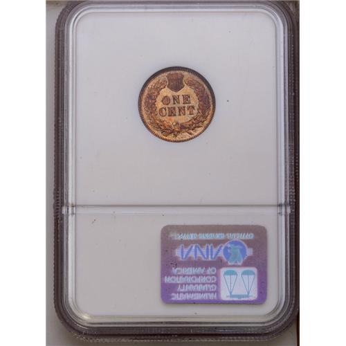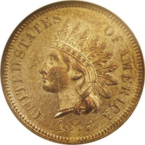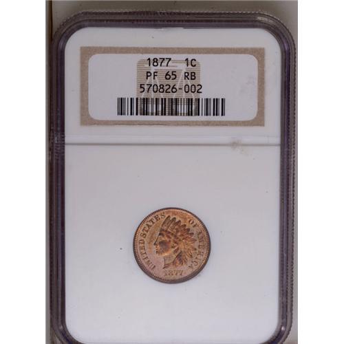 <B>1877<1C> PR65 Red and Brown NGC.</B></I> A superbly struck example of the key date to the Indian Head cent series. The color has turned from the original red to a reddish-gold with toning flecks scattered over the surfaces and multicolored underlying iridescence creating an attractive, mottled effect. This Gem example shows two trivial grazes on the lower left obverse, but no marks or defects appear anywhere else. Because of its rarity as a business strike, this date enjoys a popularity and respect afforded to none other in the series. Census: 65 in 65, 15 finer (7/06).<BR><I>From The Tigard Oregon Small Cent Collection.</B></I>