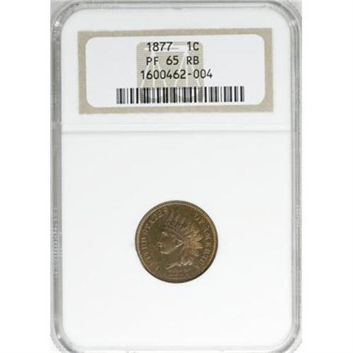 <B>1877 1C PR65 Red and Brown NGC.</B></I> While not scarcer than other proofs from the 1870s, the 1877 is immensely more desirable because of the scarcity of circulation strikes of this date. Still only 900 pieces were struck, a paltry number for the large collecting fraternity interested in Indian cents. This piece has slightly mellowed surfaces that retain a significant amount of underlying mint luster. Brightly reflective as well. <BR><BR><B>Coin Engraver:</B> James B. Longacre<BR><BR><b>Shipping:</b> Coins & Currency (<a target="_blank" href="http://www.heritageauctions.com/common/shipping.php">view shipping information</a>)