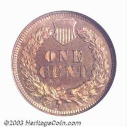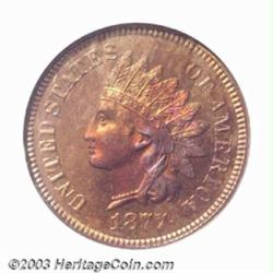 1877 1C PR66 Red and Brown NGC. Bright and flashy overall with especially reflective proof mirrors in the fields. This coin is essentially red; however, what is termed "brown" on this coin is really just a bit of hazy olive color that does little to actually dampen or darken the overall brightness of the red surfaces. An exceptionally pleasing example of this key to the Indian Cent series, and one of the finest proofs we have seen in the past several years. Population: 11 in 66, 0 finer (2/03).From the Sunnywood Collection. Important notice: We expect to be auctioning lots at the rate of 200-250 per hour. On occasion eBay live bid software cannot keep up with the pace of the auctions where 4-5 lots per minute can hammer down, so we recommend that you place a realistic absentee bid now as insurance to avoid disappointment. Also please note that all Heritage/CAA lots purchased through eBay Live carry a 20% Buyer's Premium. Please make sure you read the Terms and Conditions.