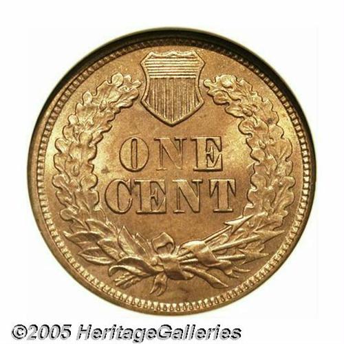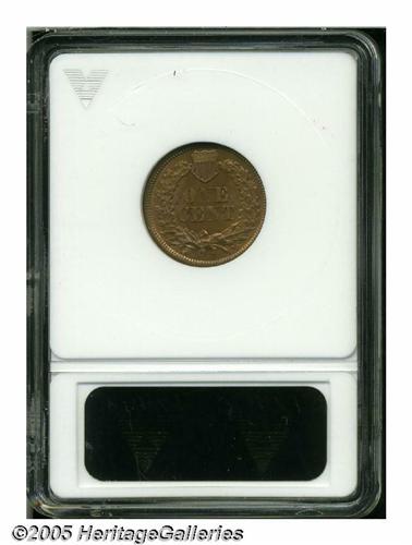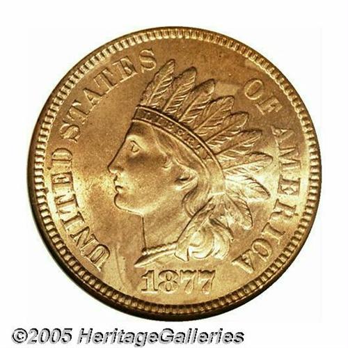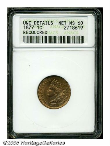 <B>1877<1C>--Recolored--ANACS. Unc Details, Net MS60.</B></I> Sharply defined, save for some of the typical softness at the center of the reverse. At first glance, this one appears to be a full red example, however, close examination reveals the surfaces have been dipped at one time. The obverse is fully bright, the reverse is slightly deeper in tone. A worthwhile, high grade example of this key date.