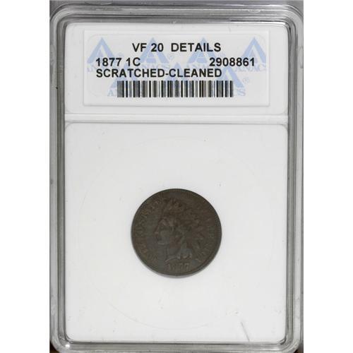 <B>1877<1C>--Scratched, Cleaned--ANACS. VF20 Details.</B></I> Retoned in shades of olive and lilac-brown, with some lighter copper color evident on each side.