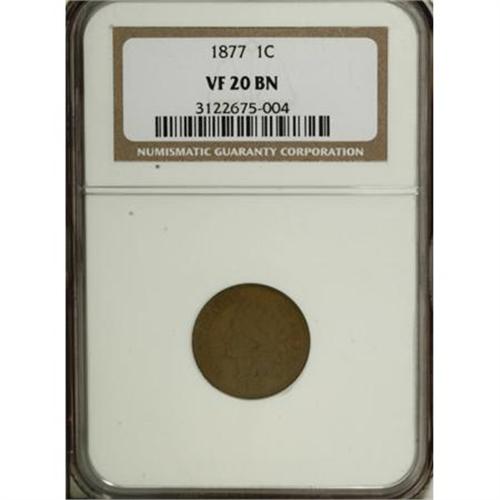 <B>1877 1C VF20 NGC.</B></I> Light to medium brown surfaces exhibit well defined devices, including the upper-most diamond and most of the letters in LIBERTY. Both sides of this key-date representative are quite clean for a coin that saw moderate circulation.<BR><I>From The John Stimson, Sr. Collection, Part Two.</B></I><BR><BR><B>Coin Engraver:</B> James B. Longacre<BR><BR><b>Shipping:</b> Coins & Currency (<a target="_blank" href="http://www.heritageauctions.com/common/shipping.php">view shipping information</a>)