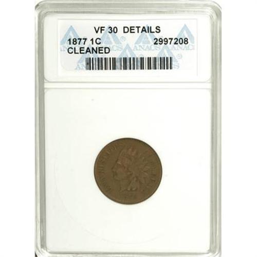 <B>1877 1C --Cleaned--ANACS. VF30 Details.</B></I> NGC Census: (64/469). PCGS Population (80/688). Mintage: 852,500. Numismedia Wsl. Price for NGC/PCGS coin in VF30: $1,750. (#2127)<BR><BR><B>Coin Engraver:</B> James B. Longacre<BR><BR><b>Shipping:</b> Coins & Currency (<a target="_blank" href="http://www.heritageauctions.com/common/shipping.php">view shipping information</a>\)