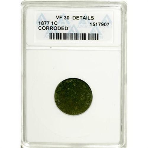 <B>1877 1C --Corroded--ANACS. VF30 Details.</B></I> This key date cent has little actual wear, but the reverse is corroded from environmental exposure. The obverse has been cleaned and darkened, but deposits are limited to protected areas. The portrait has a thin vertical mark.<BR><BR><B>Coin Engraver:</B> James B. Longacre<BR><BR><b>Shipping:</b> Coins & Currency (<a target="_blank" href="http://www.heritageauctions.com/common/shipping.php">view shipping information</a>)