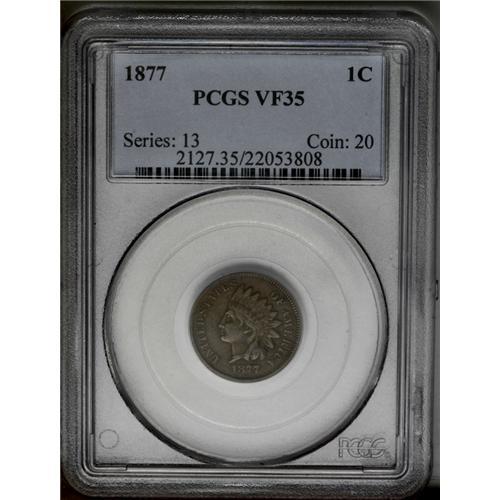 <B>1877<1C> VF35 PCGS.</B></I> An evenly worn chocolate-brown example of the key date for the Indian Head cent series. Only 852,500 business strikes are recorded for this issue.