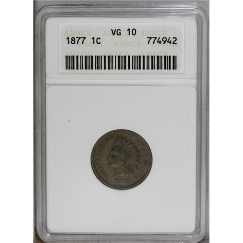 <B>1877<1C> VG10 ANACS.</B></I> Light brown surfaces are accented with sky-blue on the devices. A few minor marks are noted, none of which can be considered serious for the grade designation. A pleasing circulated and affordable example of this key-date coin that will fit nicely into a low to mid-grade Indian Head cent collection.<BR><I>From The Steve Glenn Collection.</B></I> <BR><BR><B>Important notice:</B> Heritage usually auctions material at the rate of 200-250 lots per hour. On some occasions eBay Live bid software or the Internet may not be able to keep up with the pace of the auction. We recommend placing a realistic absentee bid now as insurance to avoid disappointment. Occasionally the auctioneer may eliminate or reject an eBay Live bid, and the auctioneer may also reopen a lot after the close of the eBay live bidding (usually because we missed an audience bid), and may reject your bid even if it shows you as the winning bidder. By bidding via eBay Live, you agree that Heritage may award the lot to another bidder at its sole discretion under the circumstances described above or any other reasonable circumstances. Since eBay bids are not shown to us until we open the lot on the floor, we treat those bids just like floor bids. In most cases the floor responds before the eBay bid is presented to us, due to Internet lag time, so for consistency we have made it a policy that floor bids are always considered first over tie eBay live bids. Also please note that all Heritage lots purchased through eBay Live carry a 20% Buyer's Premium. Please make sure you read the Terms and Conditions before you bid. This lot is being auctioned in conjunction with a live floor auction by Heritage Galleries & Auctioneers. All final auction and invoice information will be supplied by Heritage Galleries & Auctioneers, and all other information should be considered preliminary. Lot:394 <BR><BR><B>Winning Notification and Billing:</B> After the FINAL session in this auction is complete, Heritage will send e-mail and snail mail invoices. This process normally takes several days. All final auction and invoice information will be supplied by Heritage Galleries & Auctioneers, and all other information should be considered preliminary. <BR><BR>This auction will be conducted on a live auction floor and over the Internet through eBay Live. If you choose to place an absentee bid, please take a moment to <font color='#0000ff'><u><a href='http://pages.ebay.com/liveauctions/help/before/laabsentee.html'>learn how eBay Live absentee bidding works</a></u></font><font color='#000000'>