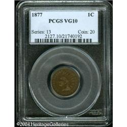 1877 1C VG10 PCGS. Pleasing medium brown color, wi <B>1877 1C VG10 PCGS.</B></I> Pleasing medium brown color, with a few areas of orange on the design features. The LI and TY of LIBERTY are visible, as are the tops of ER. A couple of tiny marks are seen in the upper right obverse field, but these are in no way serious. This piece will definitely find a home in a low to middle grade Indian cent collection. <BR><BR><B>Important notice:</B> Heritage usually auctions material at the rate of 200-250 lots per hour. On some occasions eBay Live bid software or the Internet may not be able to keep up with the pace of the auction. We recommend placing a realistic absentee bid now as insurance to avoid disappointment. Occasionally the auctioneer may eliminate or reject an eBay Live bid, and the auctioneer may also reopen a lot after the close of the eBay live bidding (usually because we missed an audience bid), and may reject your bid even if it shows you as the winning bidder. By bidding via eBay Live, you agree that Heritage may award the lot to another bidder at its sole discretion under the circumstances described above or any other reasonable circumstances. Since eBay bids are not shown to us until we open the lot on the floor, we treat those bids just like floor bids. In most cases the floor responds before the eBay bid is presented to us, due to Internet lag time, so for consistency we have made it a policy that floor bids are always considered first over tie eBay live bids. Also please note that all Heritage lots purchased through eBay Live carry a 20% Buyer's Premium. Please make sure you read the Terms and Conditions before you bid. This lot is being auctioned in conjunction with a live floor auction by Heritage Galleries & Auctioneers. All final auction and invoice information will be supplied by Heritage Galleries & Auctioneers, and all other information should be considered preliminary. Lot:5088