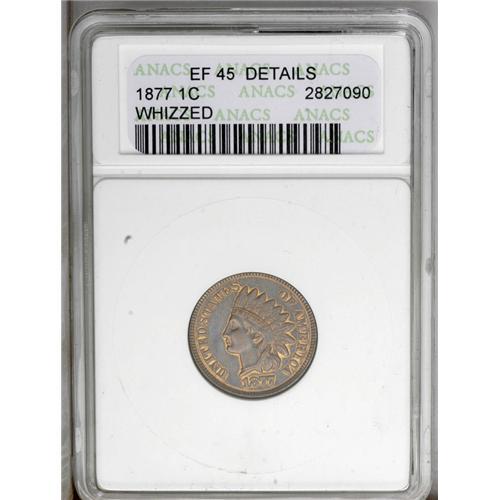 <B>1877<1C>--Whizzed--ANACS. XF45 Details.</B></I> Well struck with nearly complete design detail and just a trace of highpoint wear. A small abrasion is noted on the upper right reverse field, between E and the wreath, and the surfaces reveal faint evidence of whizzing, under close examination. Bright orange luster remnants cling to the devices. An affordable representative of this famous key date. <BR><BR><B>Important notice:</B> Heritage usually auctions material at the rate of 200-250 lots per hour. On some occasions eBay Live bid software or the Internet may not be able to keep up with the pace of the auction. We recommend placing a realistic absentee bid now as insurance to avoid disappointment. Occasionally the auctioneer may eliminate or reject an eBay Live bid, and the auctioneer may also reopen a lot after the close of the eBay live bidding (usually because we missed an audience bid), and may reject your bid even if it shows you as the winning bidder. By bidding via eBay Live, you agree that Heritage may award the lot to another bidder at its sole discretion under the circumstances described above or any other reasonable circumstances. Since eBay bids are not shown to us until we open the lot on the floor, we treat those bids just like floor bids. In most cases the floor responds before the eBay bid is presented to us, due to Internet lag time, so for consistency we have made it a policy that floor bids are always considered first over tie eBay live bids. Also please note that all Heritage lots purchased through eBay Live carry a 20% Buyer's Premium. Please make sure you read the Terms and Conditions before you bid. This lot is being auctioned in conjunction with a live floor auction by Heritage Galleries & Auctioneers. All final auction and invoice information will be supplied by Heritage Galleries & Auctioneers, and all other information should be considered preliminary. Lot:395 <BR><BR><B>Winning Notification and Billing:</B> After the FINAL session in this auction is complete, Heritage will send e-mail and snail mail invoices. This process normally takes several days. All final auction and invoice information will be supplied by Heritage Galleries & Auctioneers, and all other information should be considered preliminary. <BR><BR>This auction will be conducted on a live auction floor and over the Internet through eBay Live. If you choose to place an absentee bid, please take a moment to <font color='#0000ff'><u><a href='http://pages.ebay.com/liveauctions/help/before/laabsentee.html'>learn how eBay Live absentee bidding works</a></u></font><font color='#000000'>