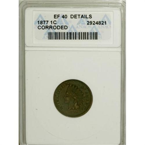 <B>1877 1C --Corroded--ANACS. XF40 Details.</B></I> Predominantly chocolate-brown with extensive green-tinged corrosion at the reverse periphery. Despite this flaw, the Indian key offered here displays beautifully, with light, even wear across the portrait.<BR><BR><B>Coin Engraver:</B> James B. Longacre<BR><BR><b>Shipping:</b> Coins & Currency (<a target="_blank" href="http://www.heritageauctions.com/common/shipping.php">view shipping information</a>)