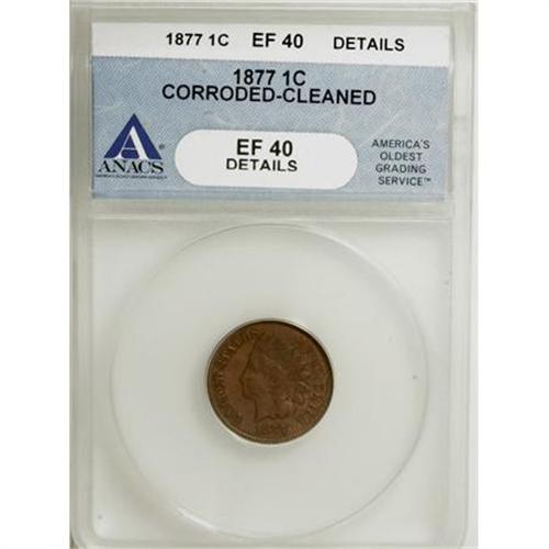 <B>1877 1C --Corroded, Cleaned--ANACS. XF40 Details.</B></I> Some relatively light corrosion is scattered about on this key date, but the surfaces are not porous. Well defined on the motifs.<BR><BR><B>Coin Engraver:</B> James B. Longacre<BR><BR><b>Shipping:</b> Coins & Currency (<a target="_blank" href="http://www.heritageauctions.com/common/shipping.php">view shipping information</a>)