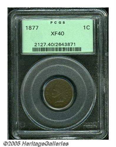 <B>1877<1C> XF40 PCGS.</B></I> A dark-brown example that retains essentially complete design details. The obverse has a couple of tiny contact marks, but the surfaces are generally problem-free for the grade. The undisputed key date to the immensely popular Indian Cent series.