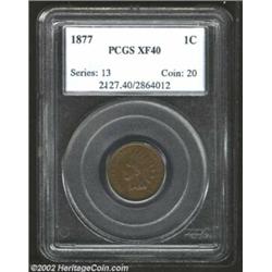 1877 1C XF40 PCGS. The glossy surfaces are richly colored in deep milk chocolate. While the center of the reverse is not fully struck, the overall appeal of the coin far exceeds what one would expect in this grade. Important notice: We expect to be auctioning lots at the rate of 200-250 per hour. Sometimes eBay Premier live bid software cannot keep up with that pace, so we strongly recommend that you place a realistic proxy bid now as insurance to avoid disappointment. Also please note that all Heritage/CAA lots purchased through eBay Premier carry a 20% Buyer's Premium. Please make sure you read the Terms and Conditions.