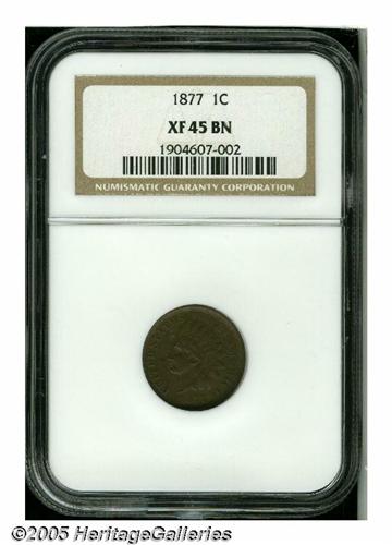 <B>1877<1C> XF45 NGC.</B></I> A smooth, lightly worn, medium brown example that displays fairly strong details. LIBERTY is bold, and the top diamond is fully outlined. The two lower diamonds reveal partial definition. A few minor marks are noted on the Indian's cheek. This coin will fit nicely into a high-grade circulated set of Indian cents.